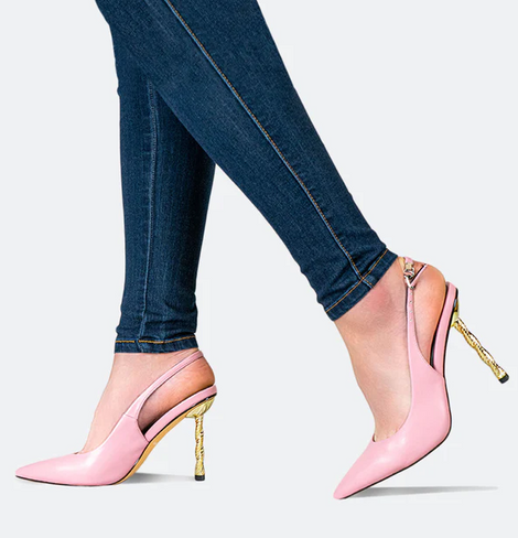 A heel carefully designed with the graceful and luxurious woman in mind, our Queenette slingback pumps features smooth leather upper supported by a twisted gold finish stiletto heel adding a sumptuous appeal.